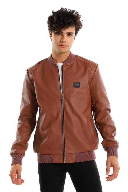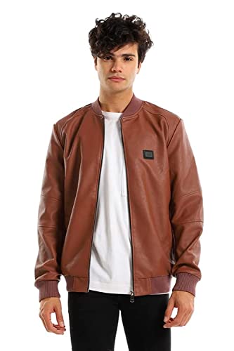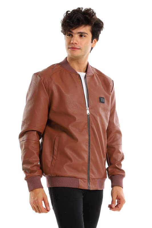 White Rabbit - جاكيت جلد بياقة ماندرين وطول يصل الى الورك، لون بني