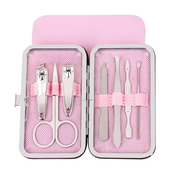 Generic - طقم باديكير للعناية بالأظافر، 7 قطع، فولاذ مقاوم للصدأ، حقيبة جلدية محمولة، للرجال والنساء (الوردي)