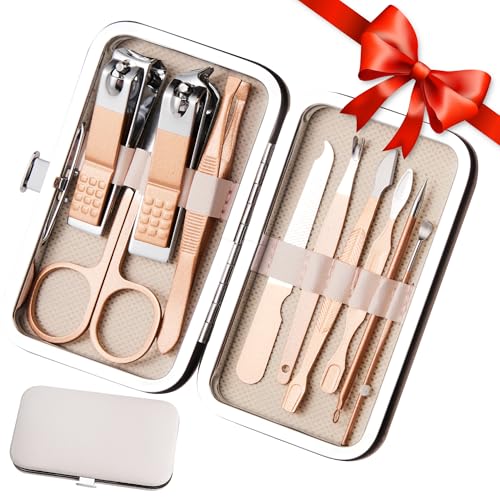 Nutrascience - مجموعة مانيكير 10 في 1، مجموعة قصافة اظافر للرجال والنساء، ادوات العناية بالاظافر من الستانلس ستيل مع شنطة سفر جلدية (ذهبي)