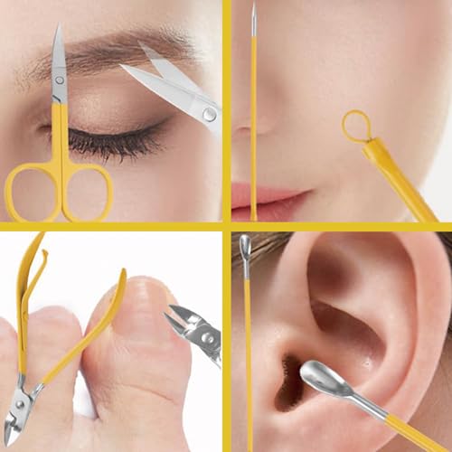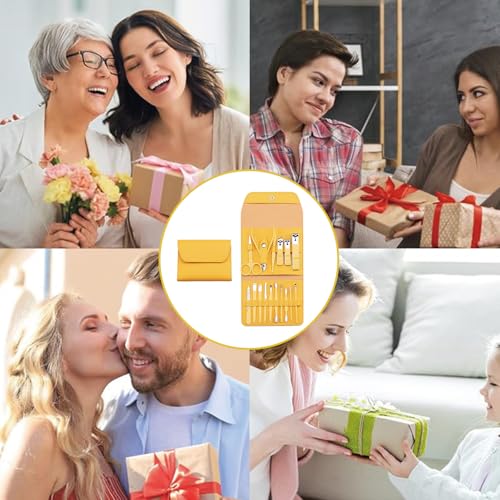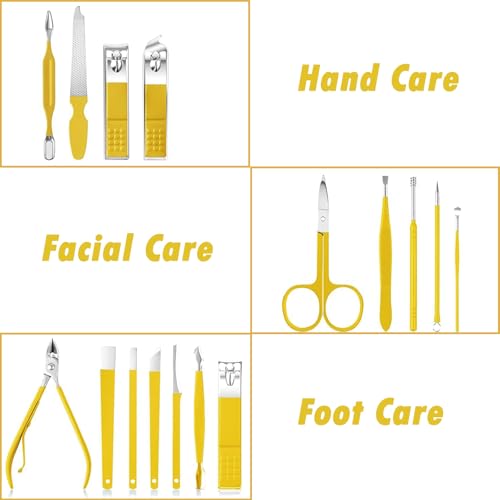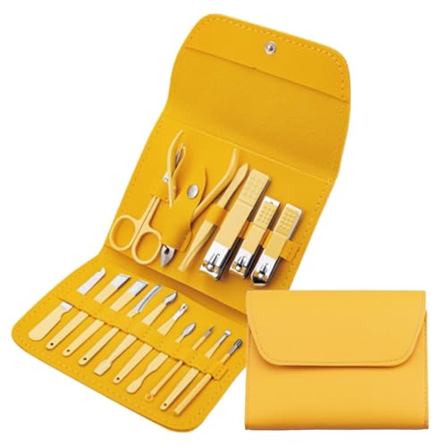 JNGTKL - أدوات المانيكير والباديكير مع مقص أظافر، مجموعة متكاملة ومتعددة الاستخدامات للعناية بالأظافر، تأتي بحافظة جلدية أنيقة ومناسبة للرجال والنساء، 16 قطعة (أصفر)