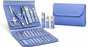 Nutrascience - مجموعة مانيكير وباديكير 16 في 1 للعناية بالاظافر للرجال والنساء، مقصات من الستانلس ستيل + مقص + مبرد وحافظة جلدية (ازرق)