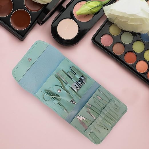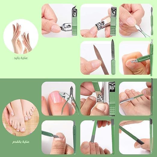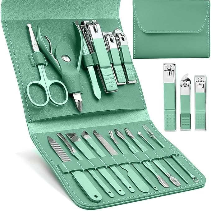 Generic - مجموعة ادوات العناية بالاظافر والباديكير 16 في 1 من الستانلس ستيل ومقص اظافر للرجال والنساء، حافظة جلدية (اخضر)