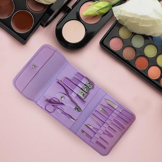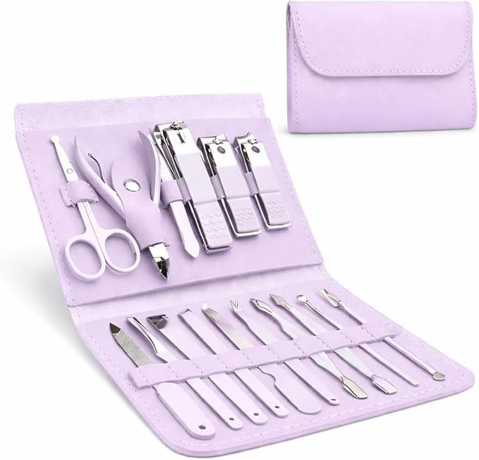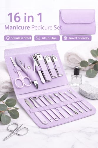 Generic - مجموعة العناية بالاظافر والباديكير 16 في 1 من الستانلس ستيل ومقص اظافر للرجال والنساء مع حافظة جلدية (ارجواني)