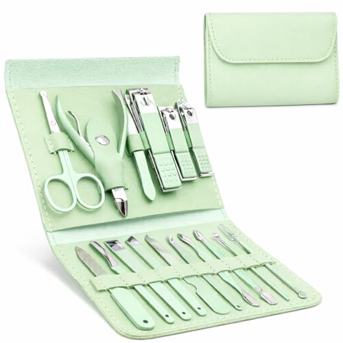 Nutrascience - مجموعة العناية بالاظافر والباديكير 16 في 1 للسفر من الستانلس ستيل، مقص اظافر للعناية بالزوائد اللحمية، حافظة جلدية (اخضر)