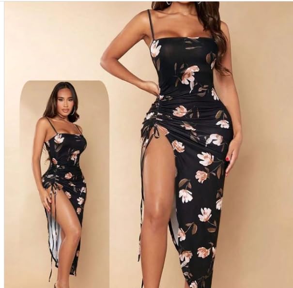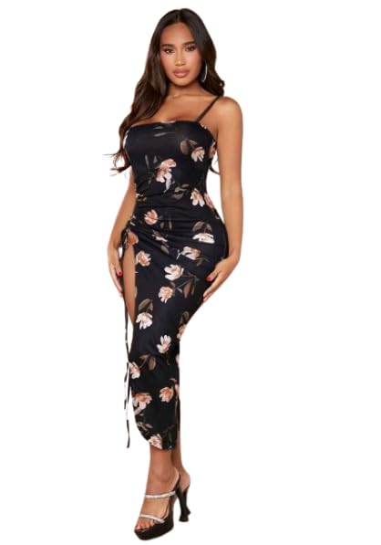 Generic - فستان متوسط الطول بطبعة زهور مع جانب مكشكش من مانيكان، أسود