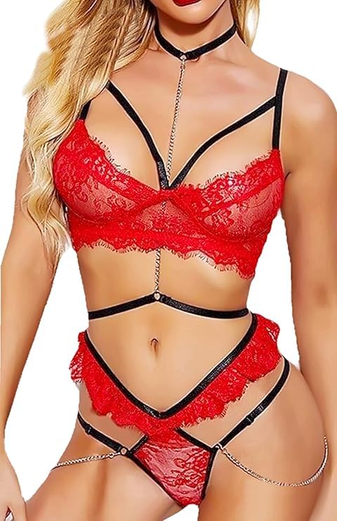 Generic - طقم لانجيري دانتيل مع حمالة صدر وحزام رباط وسراويل داخلية من مانيكان، أحمر وأسود