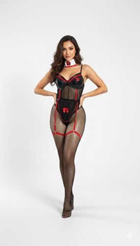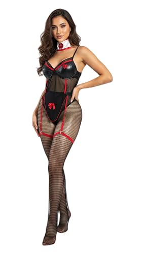 Generic - طقم لانجيري مثير للممرضة من مانيكان، أسود مع حواف حمراء، شرابات شبكية شفافة، زي لعب الأدوار من 3 قطع