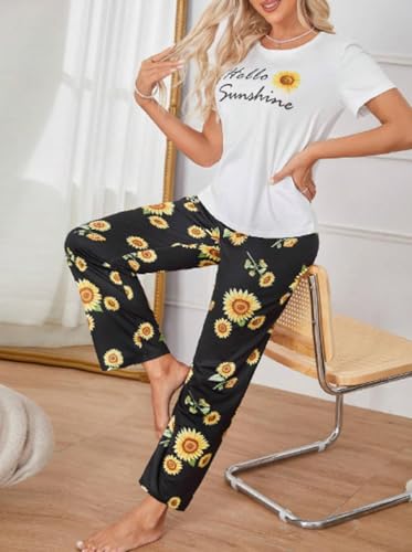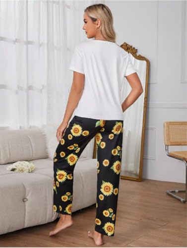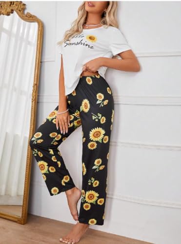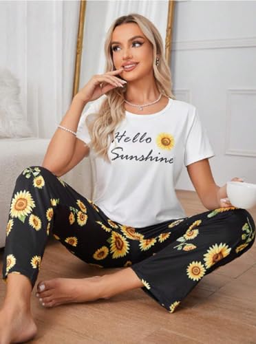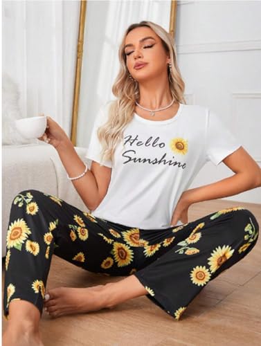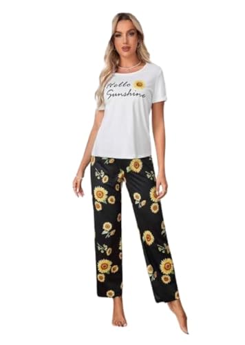 Generic - طقم بيجامة بتصميم زهرة عباد الشمس للنساء من مانيكان، قميص باكمام قصيرة وبنطلون للبنات