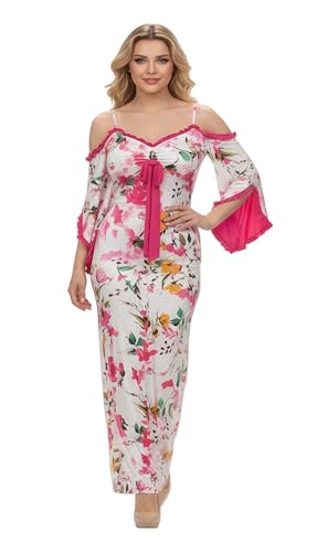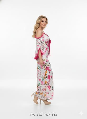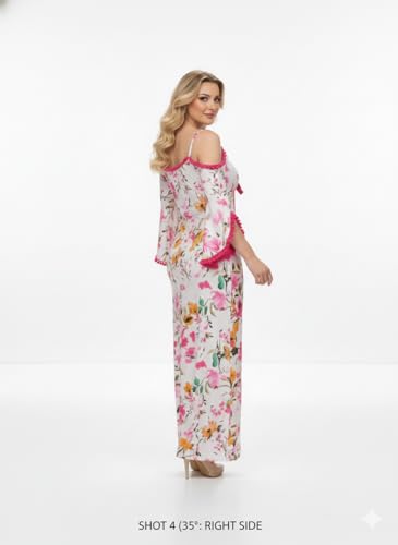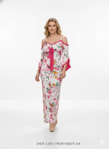 Generic - فستان ماكسي مطبوع عليه زهور للنساء من مانيكان، ابيض مع زهور وردية وبرتقالية، حزام سباغيتي، حافة مكشكشة