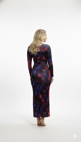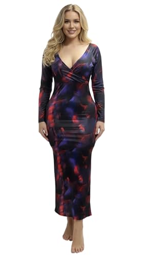 Generic - فستان ضيق انيق بقبة V للنساء من مانيكان، ازرق كحلي مع طباعة تجريدية حمراء وارجوانية واكمام طويلة متوسط الطول