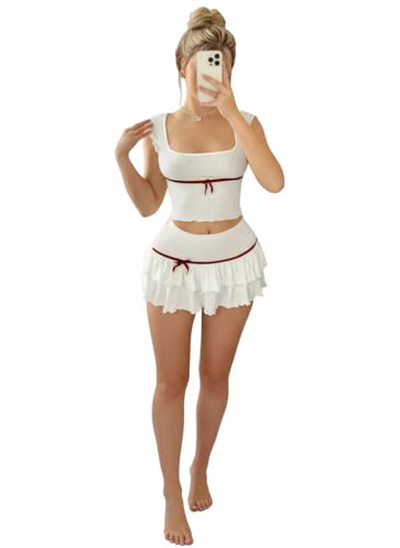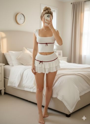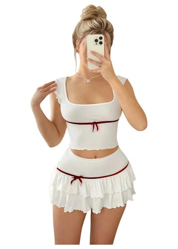 Generic - طقم ملابس داخلية للنساء مكون من قطعتين من مانيكان، بلوزة قصيرة مكشكشة بيضاء وشورت مع تفاصيل فيونكة بورغندي، مقاس واحد
