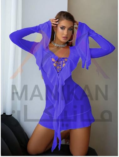 Generic - قميص نوم قصير شفاف مع تفاصيل مكشكشة ورباط امامي واكمام طويلة من مانيكان لينجري