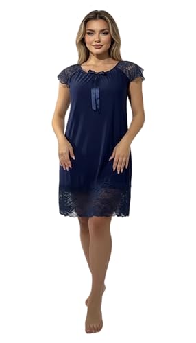 Generic - فستان لانجري باكمام قصيرة وتفاصيل رقبة مكشكشة بطول الركبة للنساء من مانيكان، لون ازرق كحلي