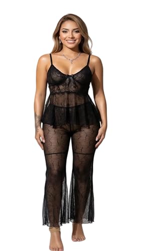 Generic - طقم ملابس نوم للنساء من مانيكان، بلوزة كامي شبكية شفافة من الدانتيل مع بنطلون بيبلوم وواسع من الاسفل قابلة للتمدد وجيدة التهوية ومريحة وخفيفة الوزن، ملابس نوم منزلية بتصميم مريح وسهل العناية