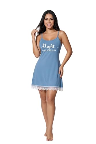 Generic - فستان نوم بحمالات رفيعة وحافة من الدانتيل مطبوع بعبارة Night Need More Sleep للنساء من مانيكان، لون أزرق
