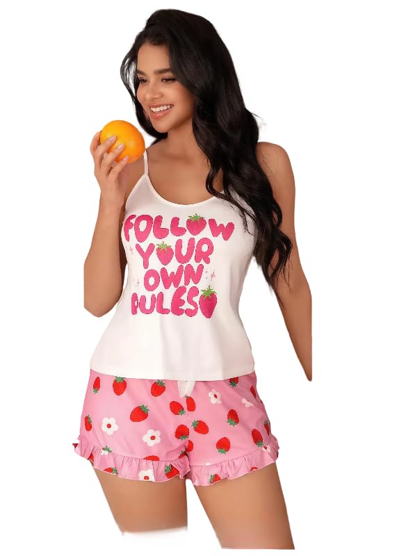 Generic - طقم بيجامة للنساء من مانيكان، ثوب نوم مصنوع من قماش قطني ناعم لمزيد من الراحة، توب كات بدون اكمام مع شورت مطبوع عليه فراولة بينك وابيض قصة عادية
