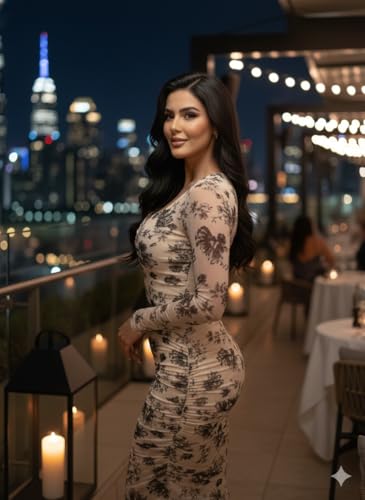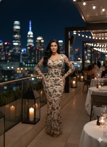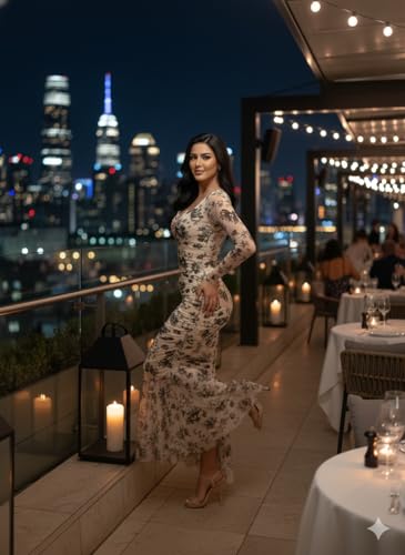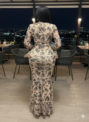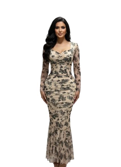 Generic - فستان أنيق بطبعة زهور بأكمام طويلة مع تصميم مطبوع بنمط زهور سوداء وخط رقبة على شكل قلب فستان للمناسبات الرسمية بطول يصل إلى الكاحل للنساء من مانيكان
