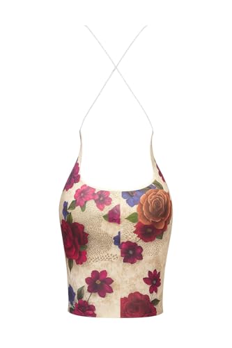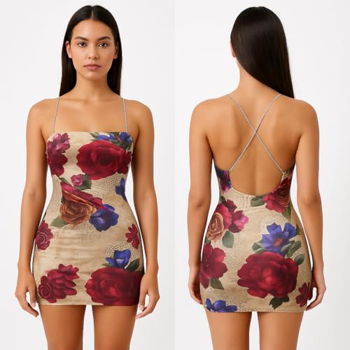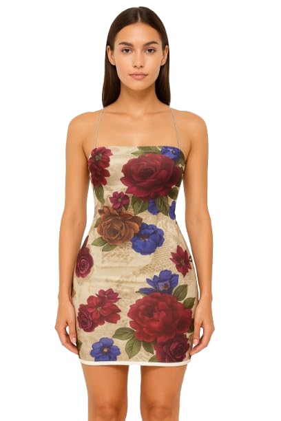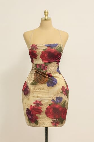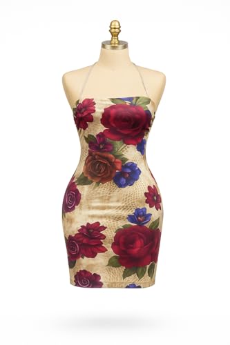 Generic - ملابس داخلية نسائية من مانيكان، فستان كوكتيل قصير مطبوع عليه زهور مع تفاصيل دانتيل وتصميم بدون حمالات وظهر متقاطع