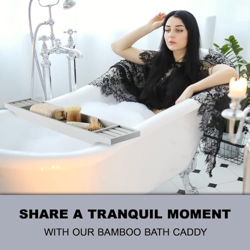 - حامل مستلزمات البانيو، صينية حمام من الخيزران باللون الأبيض مع جميع وسائل الراحة المنزلية - حامل مستلزمات الحمام يجعل الاسترخاء في حمامك أكثر روعة مع اكسسوارات الحمام المثالية، استمتع بنقع دافئ أثناء مشاهدة التابلت أو قراءة كتابك المفضل أو تناول مشروب للاستحمام الفاخر في كل مرة.
