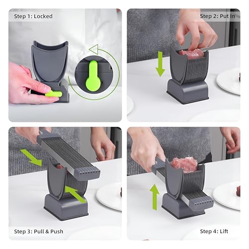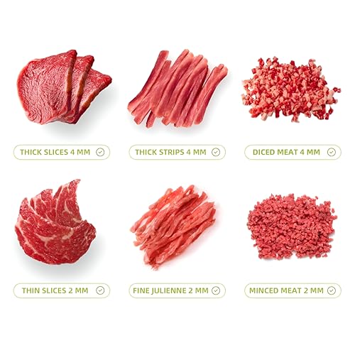 - مصممة بما يصل إلى 17 شفرة من الستانلس ستيل، يمكن لهذه القطاعة إنتاج 18 شريحة موحدة من اللحوم الطازجة في تمريرة واحدة فعالة. من خلال ضبط اتجاه اللحم، يمكنك أيضًا إنشاء قوام ممزق أو مكعبات مكعبات أو أنماط رغوية، مما يعطي تنوعًا في الطهي.