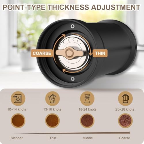 - خشن ولمسة نهائية قابلة للتعديل - يحتوي دليل مطحنة حبوب القهوة على تعديل مدمج للسمك من نوع النقطة، في اتجاه عقارب الساعة إلى ناعم وعكس اتجاه عقارب الساعة إلى الخشنة، يمكن أن يساعدك على الحصول على مسحوق قهوة ناعم أو خشن وسهل التحكم.