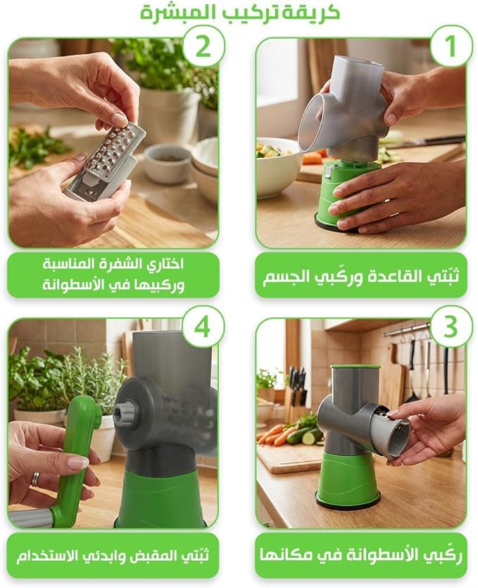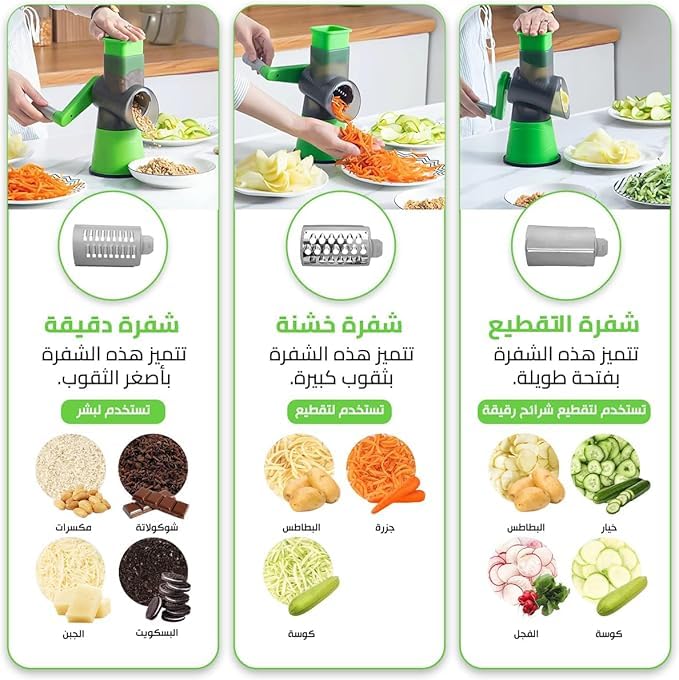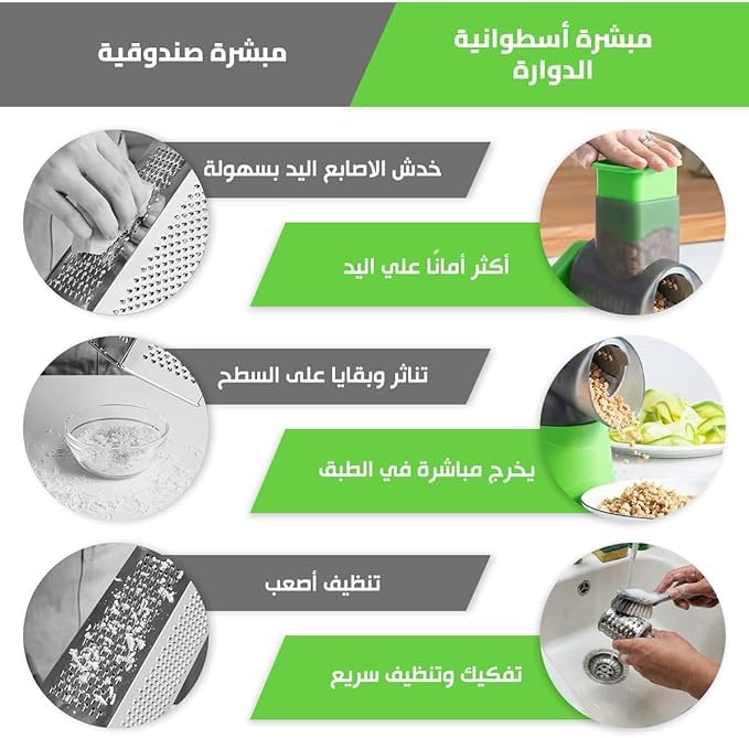 - استخدمها كمبشرة دوارة للجبن والجزر والخيار والبطاطس والفواكه. مثالية للسلطات والسندويشات وإضافات المعكرونة وأطباق الوجبات الخفيفة الصحية.