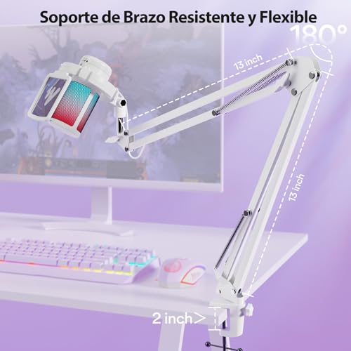 - حامل ذراع متين ومرن - حامل ذراع معدني سهل التركيب يمكن تعديله لدعم مجموعة متنوعة من التكوينات. يمكنك تقريب الميكروفون بسرعة من فمك عند الاستخدام أو طيه لتوفير مساحة أكبر. يمكن لحامل الصدمات أن يقلل من ضوضاء الجهاز واهتزازه الناجم عن اللعبة، ويمكن لفلتر البوب القابل للإزالة تقليل الضوضاء دون حجب شاشة الكمبيوتر.