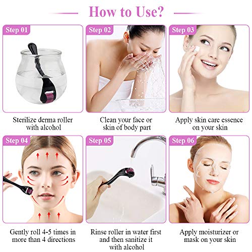 - عقمي الديرما رولر بالكحول، ثم قومي بتنظيف بشرتك وضعي كريم للعناية بالبشرة. قم بلفها بلطف من 4 إلى 5 مرات في أكثر من 4 اتجاهات على بشرتك. اشطفي الديرما رولر بالماء أولاً ثم قومي بتعقيمها بالكحول. أخيرًا، ضعي المرطب أو القناع على بشرتك. هناك مقاسات 0.5 ملم و1.0 ملم و1.5 ملم و2.0 ملم 0.5 ملم للوجه والعين وفروة الرأس. 1 ملم للوجه والرقبة. 1.5 ملم و2.0 ملم للجسم