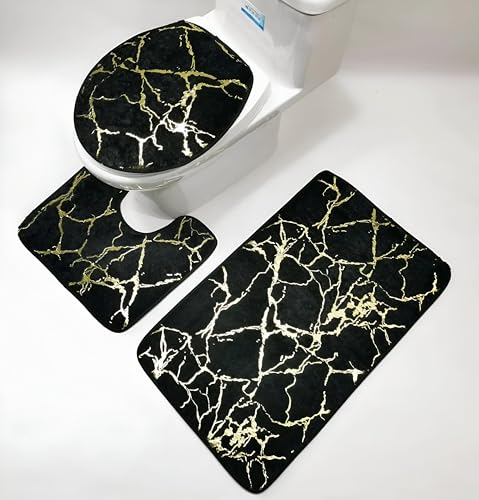 Generic - بساط حمام رخامي - تصميم عصري غير قابل للانزلاق مع غطاء مقعد المرحاض، إكسسوارات حمام قابلة للغسل مكونة من 3 قطع باللون الذهبي الفاخر لتحديث حمام أنيق