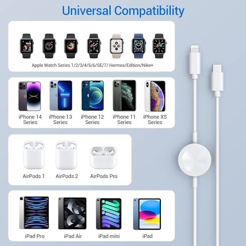 - تصميم محمول 2 في 1: كابل الشحن لساعة ابل خفيف الوزن وصغير الحجم، مثالي للسفر. كابل الشحن بطول 2 متر يلبي مجموعة متنوعة من السيناريوهات في الحياة اليومية. اشحن أجهزة متعددة بجهاز واحد فقط. ملاحظة: تبعد محطة شحن ساعة ابل وموصل لايتنينج بمقدار 20 سم فقط، ويوصى بشحنها في وقت واحد على سطح مستوٍ..