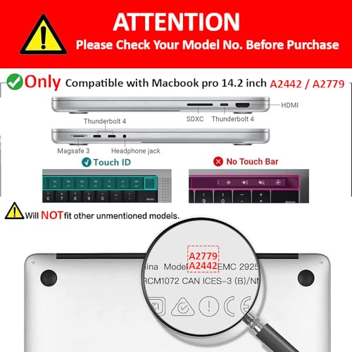 - [ملاحظة رقم الموديل: ] غطاء لجهاز ماك بوك برو 14 انش 2021 2023 (شاشة عرض قطرية 14.2 انش) - هذه الحافظة متوافقة فقط مع ماك بوك برو 14 انش موديل A2442 A2779 M1 M2 برو ماكس رقاقة مع خاصية تاتش اي دي، إصدار 2021 2022. أبعاد الهيكل (الطول × العرض ):30.5 × 8.7 × 0.4 انش، القطر: 14.2 انش. تنبيه: 14 انش هو قياس طول القطر، وليس طول الهيكل، يرجى التأكد من ذلك والتأكد من الطريقة الصحيحة لقياس 14 انش.
