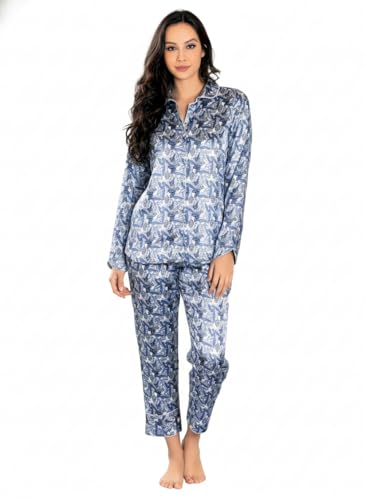 Marti Homewear & Lingerie - طقم بيجامة انيق من الساتان بطبعة اوراق شجر وقبة كلاسيكية للنساء من مارتي هوم وير اند لانجري 4294