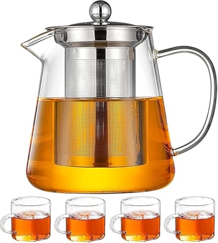 Mash - طقم ابريق شاي من زجاج البوروسيليكات المقاوم للحرارة 950 مل مع مصفاة لاوراق الشاي السائبة، امن للاستخدام في الميكروويف والموقد 4 قطع 100 مل من زجاج البوروسيليكات الشفاف