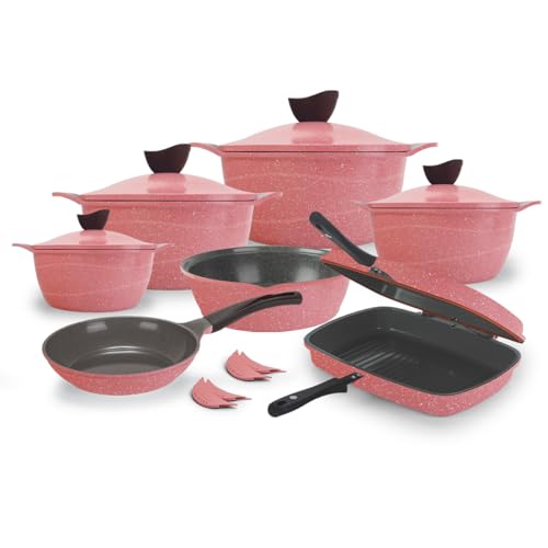 Trueval - طقم جرانيت ماستر 16 قطعة (حلة 20 - 24 - 28 - 32 - طاسة قلي 24 - شواية مزدوجة 36 - صينية 26 - 4 حوامل) فلامنجو - الموديل: ويف