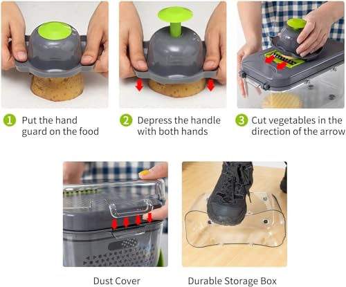- ✅ (متنوعة الاستخدامات) تحتوي على جهاز قطع وحاوية للثلاجة مع فتحة تصفية، بالإضافة إلى مبشرة وقطاعة خضار و14 سلاحًا مختلفًا لبشر الخضار بأشكال مختلفة وتقطيعها إلى شرائح دائرية أو مقرمشة، بالإضافة إلى تقطيع البطاطس إلى شرائح.