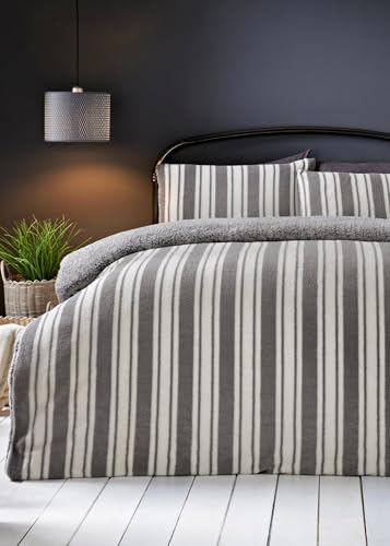 Matalan - طقم غطاء لحاف تيدي من الصوف بطبعة مخططة ماتالان مقاس كينغ لون رمادي بوليستر مُخطط عدد الخيوط: 200 .