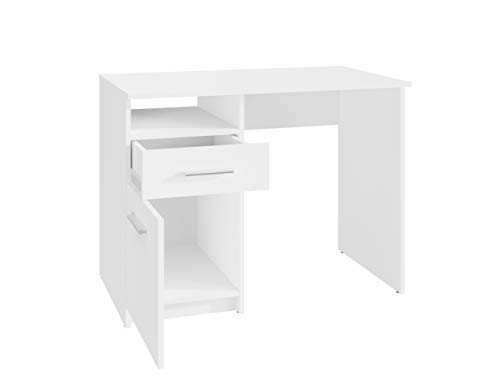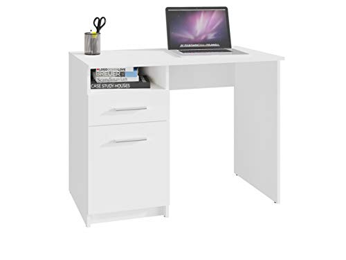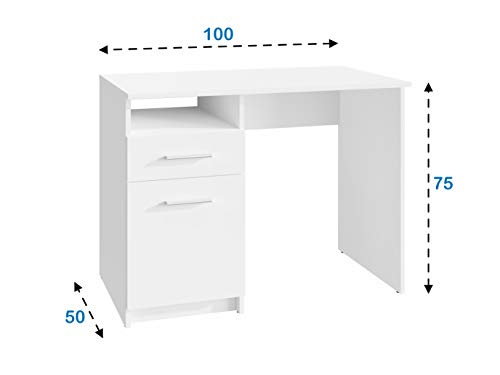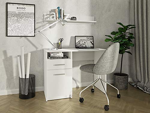 MATKAM - مكتب بودو دي اس بي من ماتكام ارتفاع 75 × عرض 100 × عمق 50 سم، سطح أثاث معزول، درج مع قضبان معدنية على عجلات، رف مع باب، مفصلات معدنية، مقابض لامعة (أبيض)