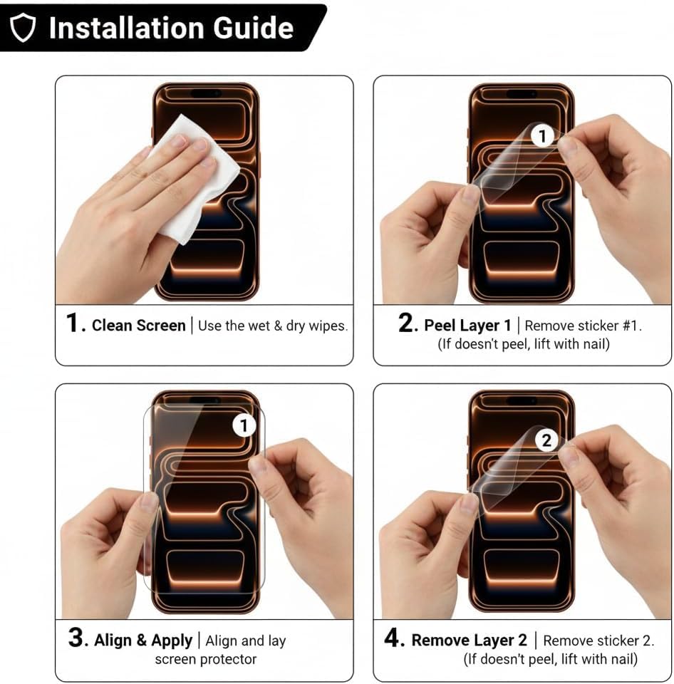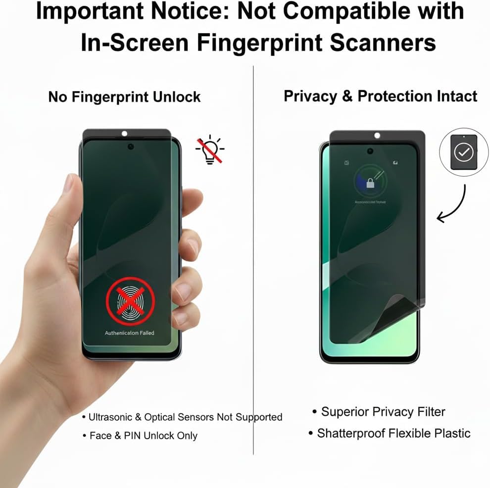- إخلاء مسؤولية بصمات الأصابع: نظرًا لدمج طبقتي الحماية المطفية والخصوصية معًا، فإن شاشة الحماية هذه لا تدعم مستشعر بصمات الأصابع في الشاشة.