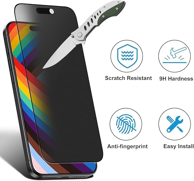 - مضادة لبصمات الأصابع وللتوهج، شاشة خصوصية بدرجة صلابة 9 H، مقاومة للخدش.