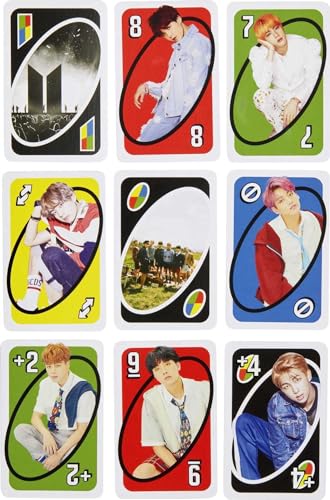 - تتميز كل بطاقة في مجموعة أوراق اللعب الملونة اونو بتصميم فرقة بي تي اس بصور لأعضاء مجموعة الكي بوب المفضلة للمعجبين