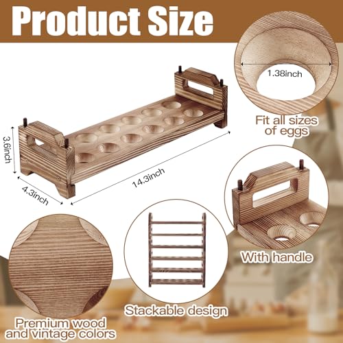 - حجم فعال وتصميم قابل للتكديس: يتميز بأبعاد حوالي 14.3 × 4.3 × 3.6 انش، يوفر حامل البيض الخشبي مساحة تخزين واسعة دون أن يشغل مساحة كبيرة على سطح الطاولة؛ والأهم من ذلك، يسمح لك تصميمه القابل للتكديس بالاستخدام من 1 إلى 6 طبقات وفقًا لاحتياجاتك، مما يضمن أقصى قدر من الكفاءة