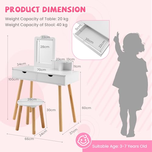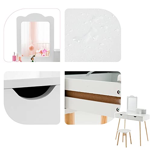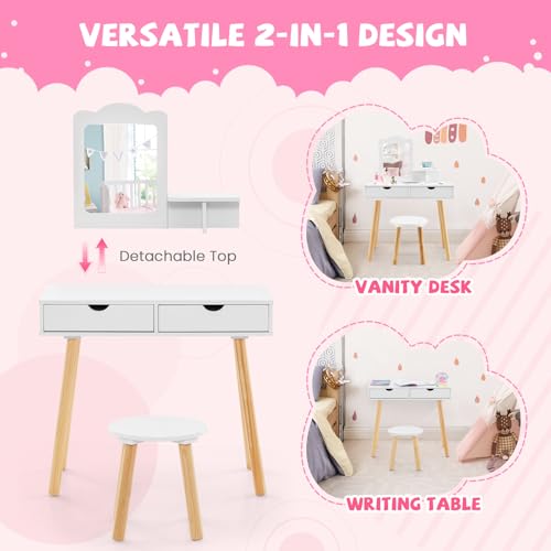 Maxmass - طاولة زينة للأطفال 2 في 1 من ماكسماس، مجموعة طاولة زينة خشبية للأطفال مع مرآة قابلة للفصل ودرجين ورف مفتوح، مكتب لخزانة مكياج الأميرة للبنات (أبيض)