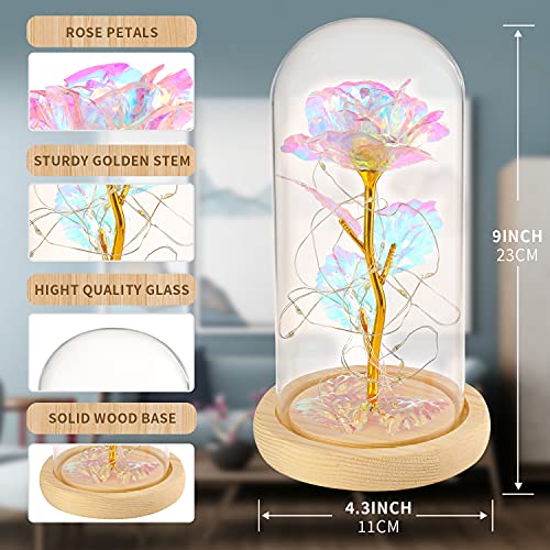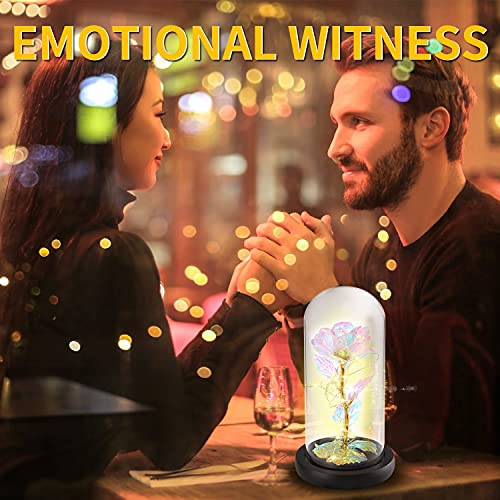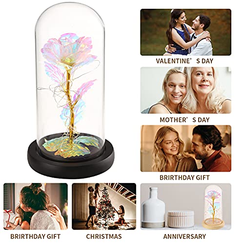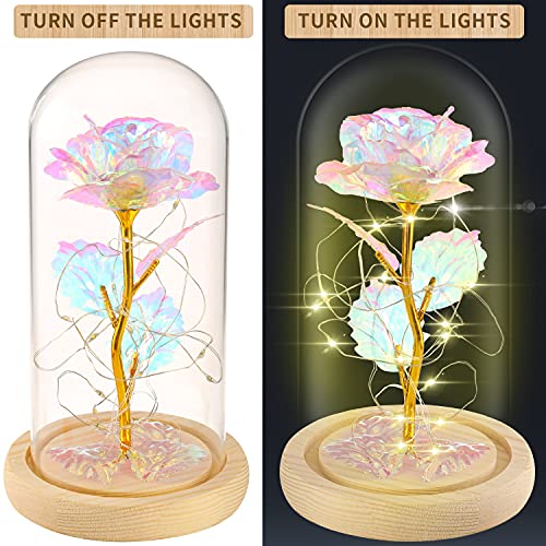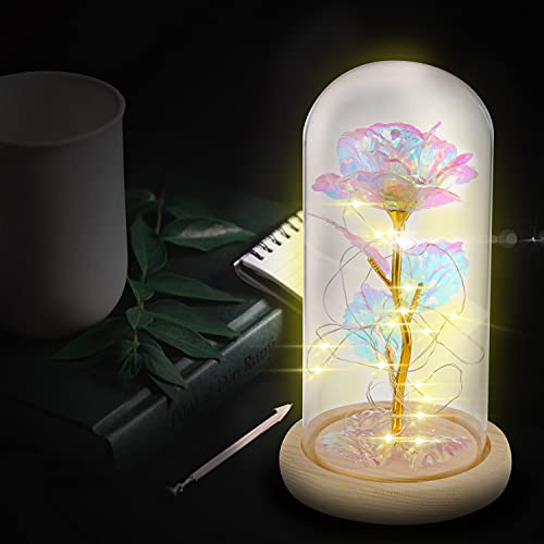 MAXSPT - هدايا للنساء، هدية عيد ميلاد عبارة عن وردة ساحرة ملونة على شكل زهرة مجرة ضوئية في قبة زجاجية، هدايا فريدة لزفافها والذكرى السنوية وعيد الام (وردة ملونة - قاعدة بيضاء)