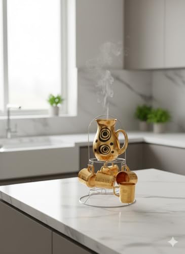 - طقم متكامل من 8 قطع: يتضمن إبريق تقديم كبير مع 6 أكواب متطابقة وحامل معدني من الستانلس ستيل لتنظيم وعرض أنيق على طاولتك