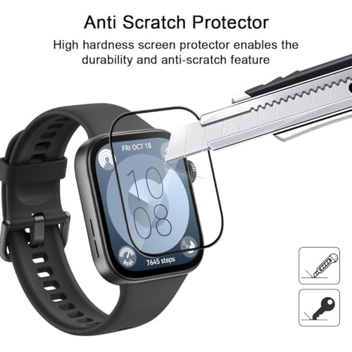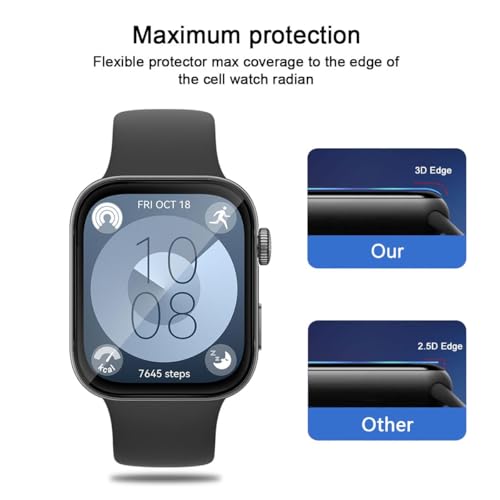 - ملاءمة مثالية: مقارنة مقاس الشاشة من واحد إلى واحد لملاءمة مثالية لساعتك. نظرًا لمرونة المواد، يمكن تغطية المناطق المنحنية بطبقة الحماية هذه. قم بتسليح سوارك الذكي دون ترك زوايا ميتة.