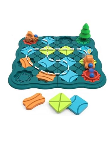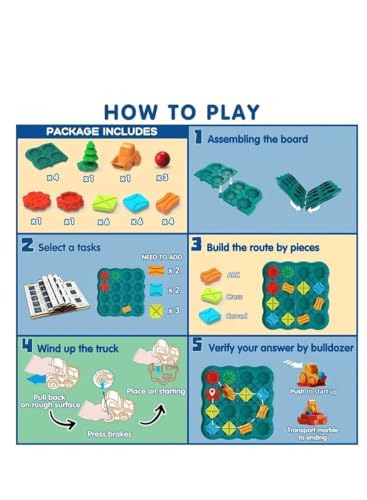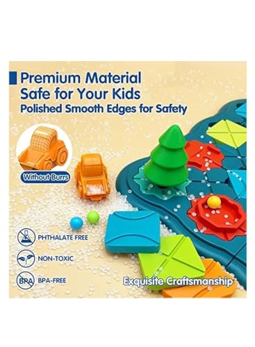 - تصميم مبتكر: لوحة لعب زرقاء مع مسارات متعددة وقطع ملونة متنوعة تشمل شاحنة برتقالية وعناصر هندسية