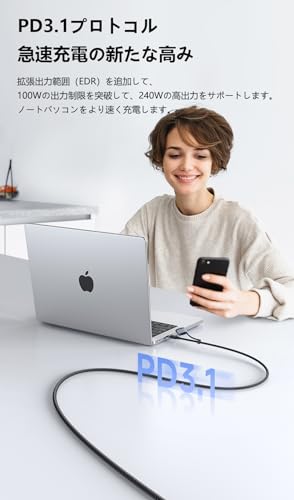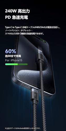 - خرج عالي 240 واط: كابل مقسم من النوع سي إلى نوع سي يدعم تيارًا كبيرًا يبلغ 48 فولت / 5 أمبير. يمكنه شحن أجهزة USB-C بسرعة مثل أجهزة اللاب توب والتابلت والهواتف الذكية وما إلى ذلك. اشحن موبايل ايفون 15 الخاص بك حتى 60% في حوالي 30 دقيقة. البيانات المذكورة أعلاه مأخوذة من ميكدودو Laboratories. الشحن السريع لبروتوكول PD3.1: الارتفاع الجديد للشحن السريع: يتجاوز نطاق الإخراج الممتد (EDR) حد الإخراج 100 واط، ويدعم الناتج العالي 240 واط. اشحن اللاب توب الخاص بك بشكل أسرع 【يدعم نقل البيانات عالي السرعة】: يدعم سرعة نقل 480 ميجابت في الثانية وشحن سريع ونقل عالي السرعة في نفس الوقت