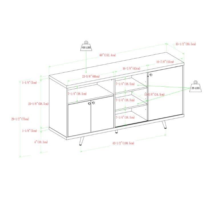 - الأبعاد: الطول: 152.4 سم × العمق: 39 سم × الارتفاع: 75 سم