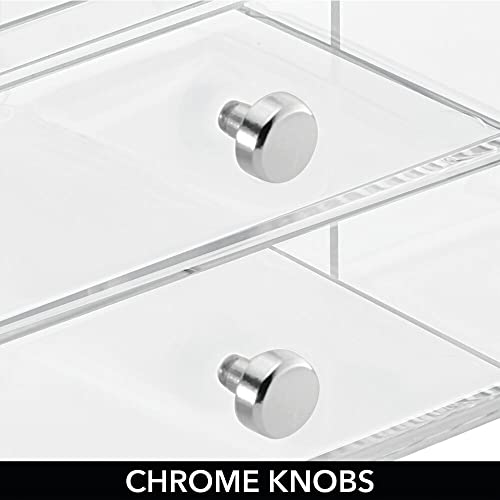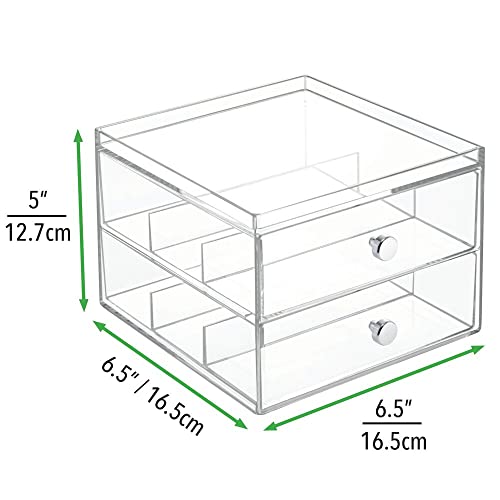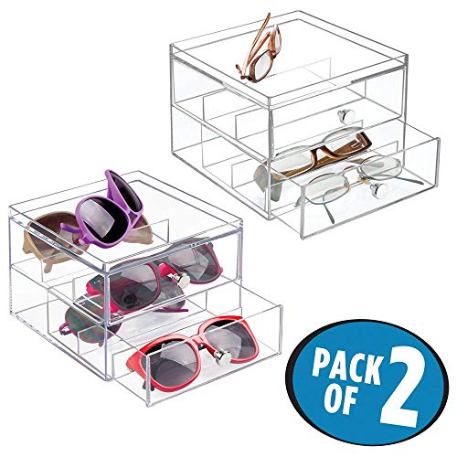 mDesign - صندوق تخزين بلاستيكي قابل للتكديس من ام دبزاين لتخزين النظارات الشمسية ونظارات القراءة والاكسسوارات - درجين مقسمين، مقابض من الكروم، عبوة من قطعتين - شفاف