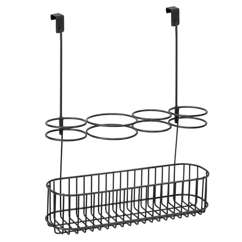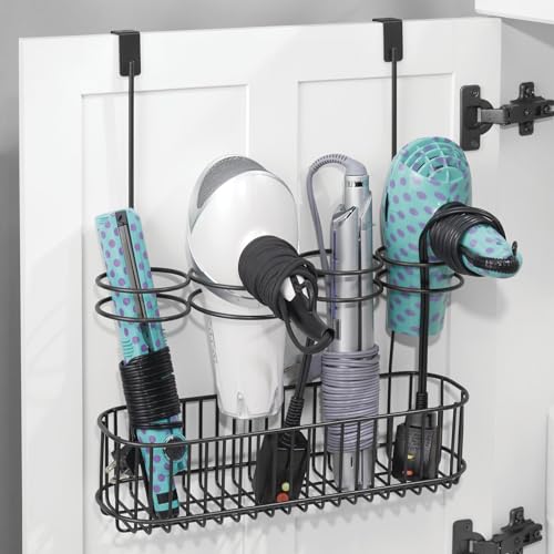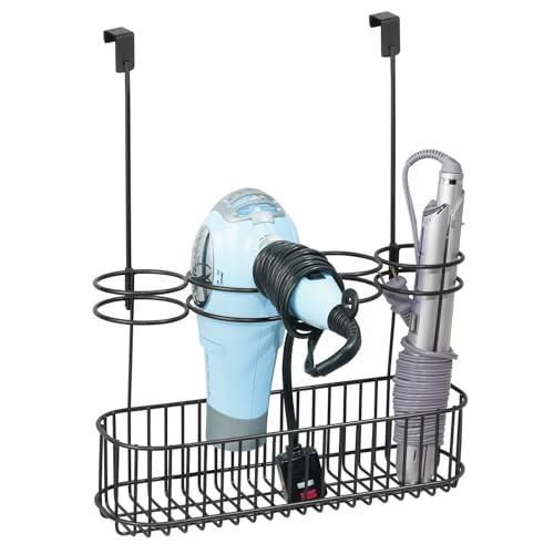 mDesign - سلة تخزين معدنية لتنظيم أدوات العناية بالشعر والتصفيف في الحمام توضع فوق الباب لمجفف الشعر والمكواة المسطحة وعصي التمويج ومكواة تمليس من ام ديزاين تعلق على أبواب الخزانة الداخلية - الخارجية أسود